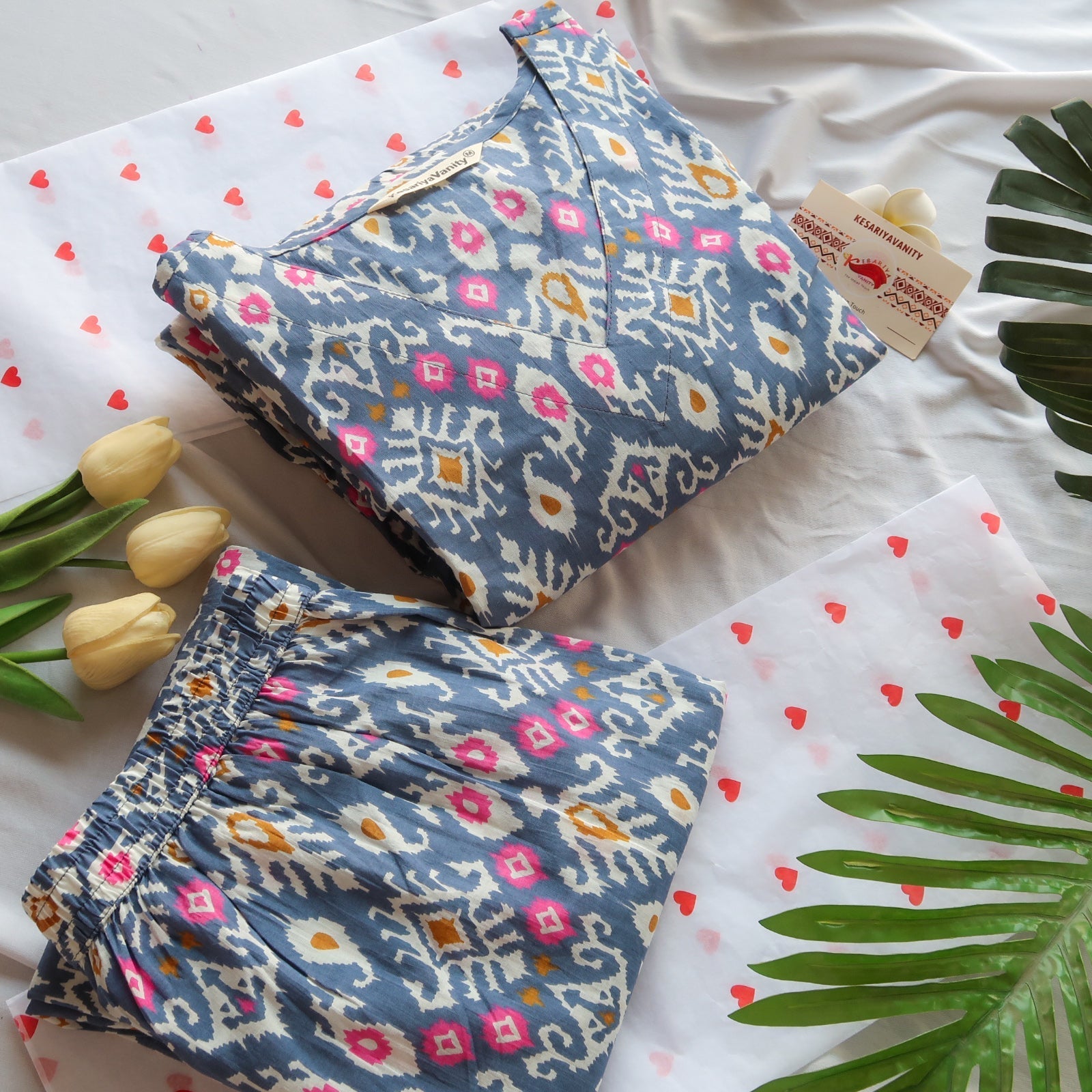 This pure cotton kurta pants set showcases a vibrant blue base adorned with striking off-white and multicolored ikat prints, creating a lively and artistic aesthetic. Designed in an elegant Alia cut frock style, the kurta features a flattering silhouette with no side slits and comfortable 3/4th sleeves, making it a versatile choice for both casual outings and special occasions.