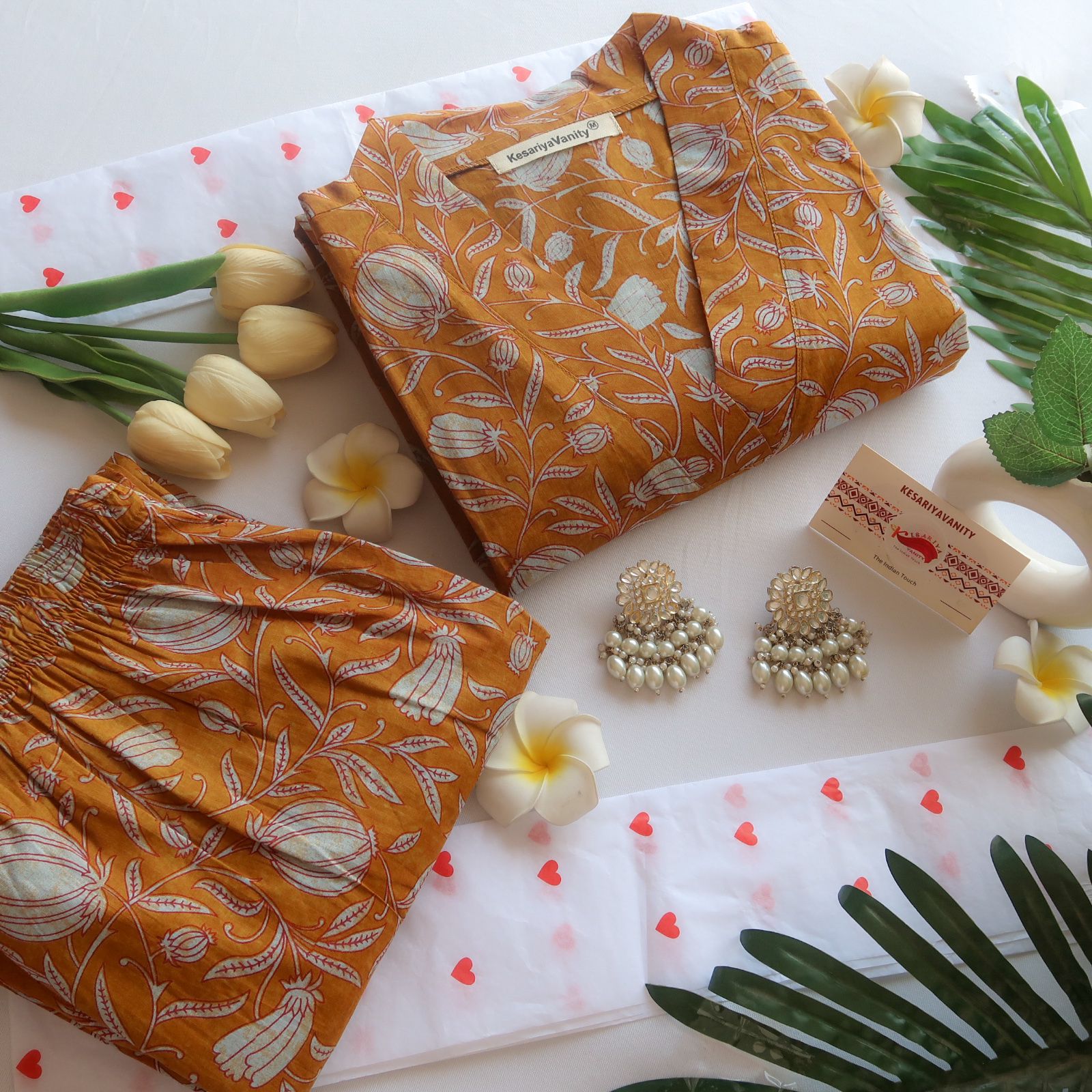 Completing the set are straight-fit pants in the same mustard yellow base, embellished with matching lotus floral prints, creating a harmonious and eye-catching ensemble. Crafted from soft, breathable cotton, this suit set ensures all-day comfort while keeping you stylish and poised.