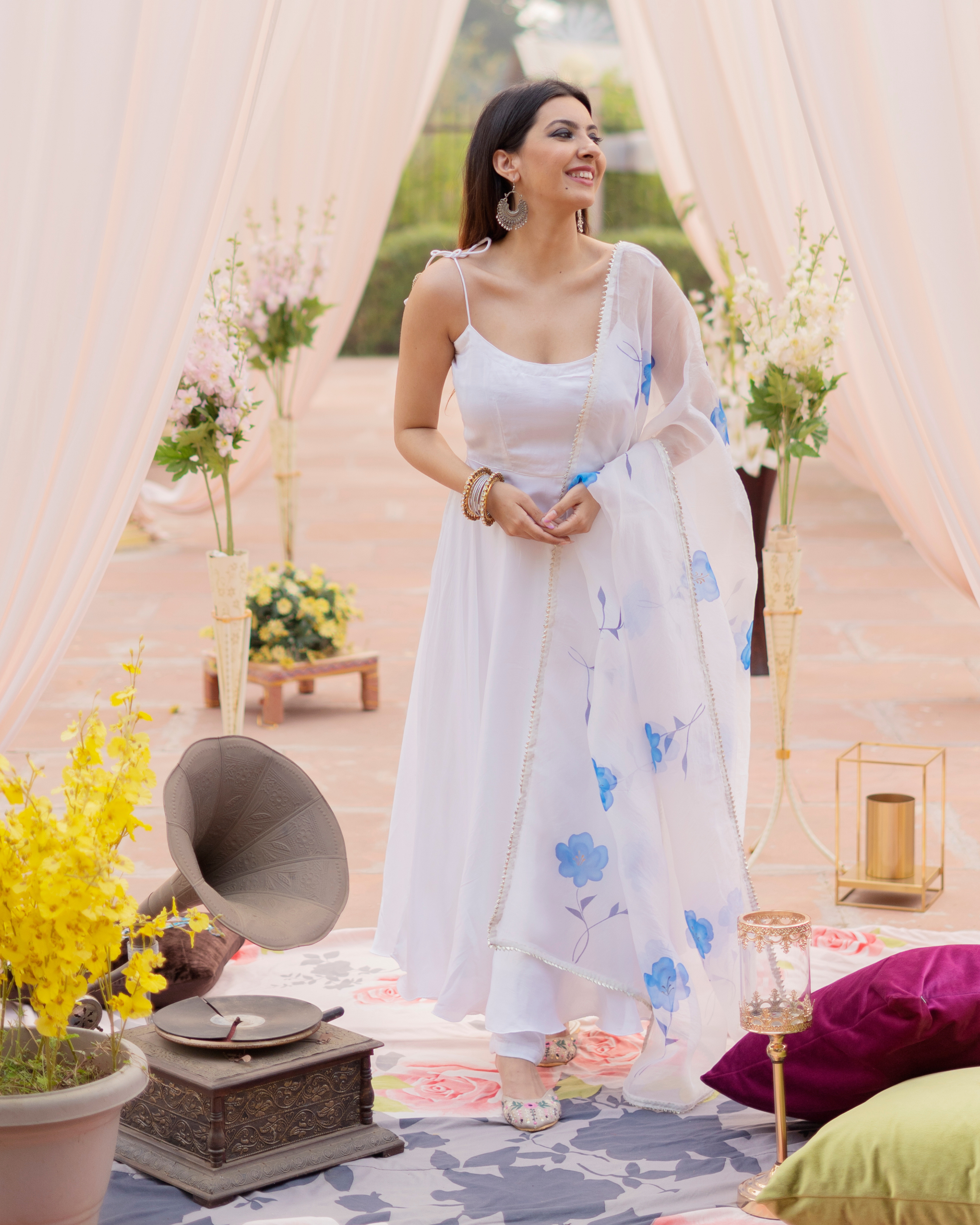 White satin handpainted suit set paired with pant and dupatta. This set is adorned with handpainted print all over it.