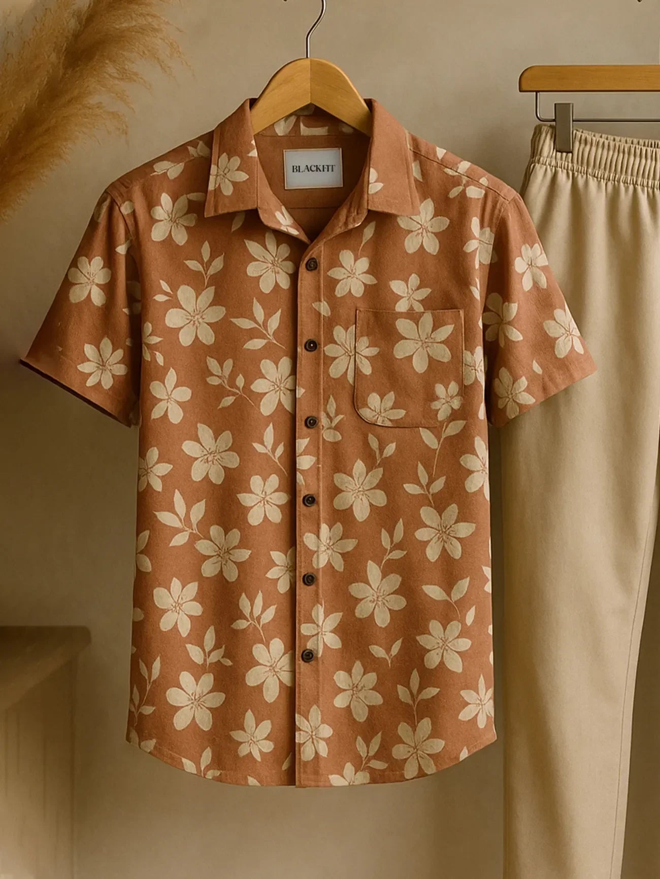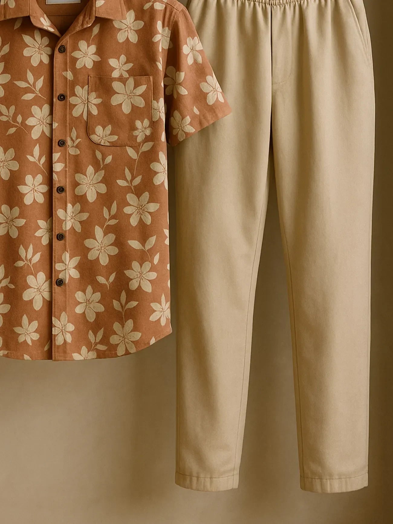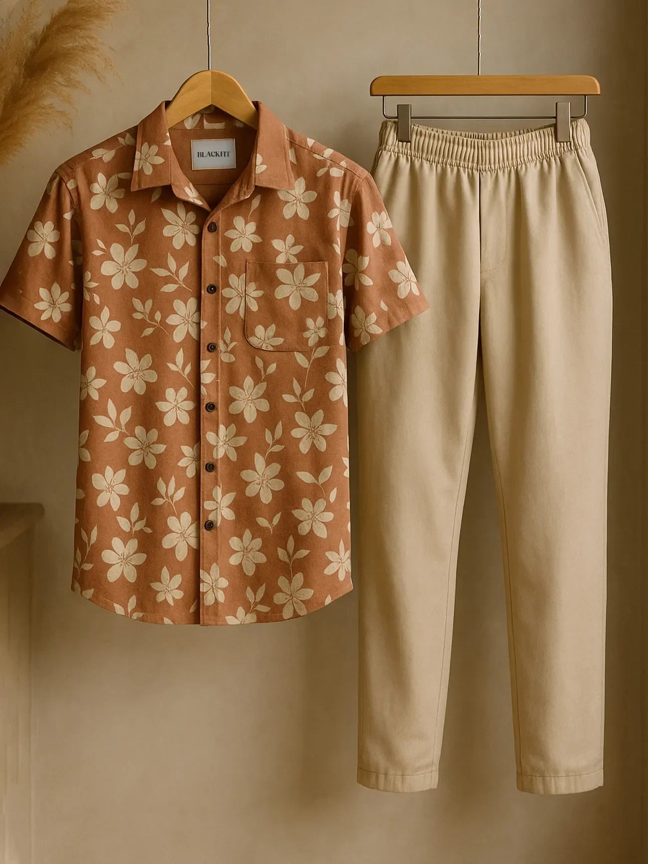 Embrace effortless charm with this earthy Korean-style co-ord set, designed for those who appreciate vintage flair and everyday comfort. The shirt features a soft rust tone adorned with cream floral prints, offering a subtle retro aesthetic. Paired with minimal beige trousers crafted from breathable cotton, this set strikes the perfect balance between laid-back and put-together.