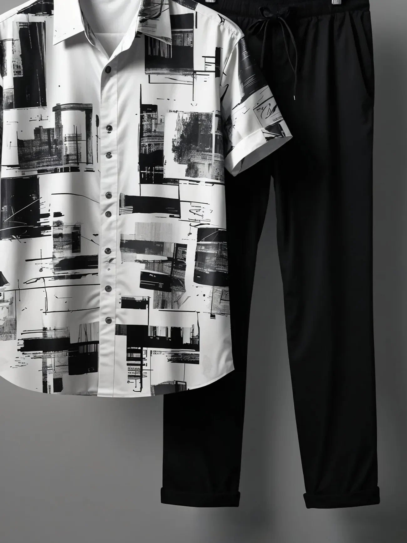 Make a modern statement with this monochrome Korean-style co-ord set that blends urban art with everyday comfort. The shirt features a striking black and white abstract print inspired by cityscapes and brushstroke graphics, offering an edgy yet refined vibe. Paired with solid black drawstring trousers, this co-ord set delivers a sleek silhouette that’s perfect for streetwear lovers and minimalists alike.