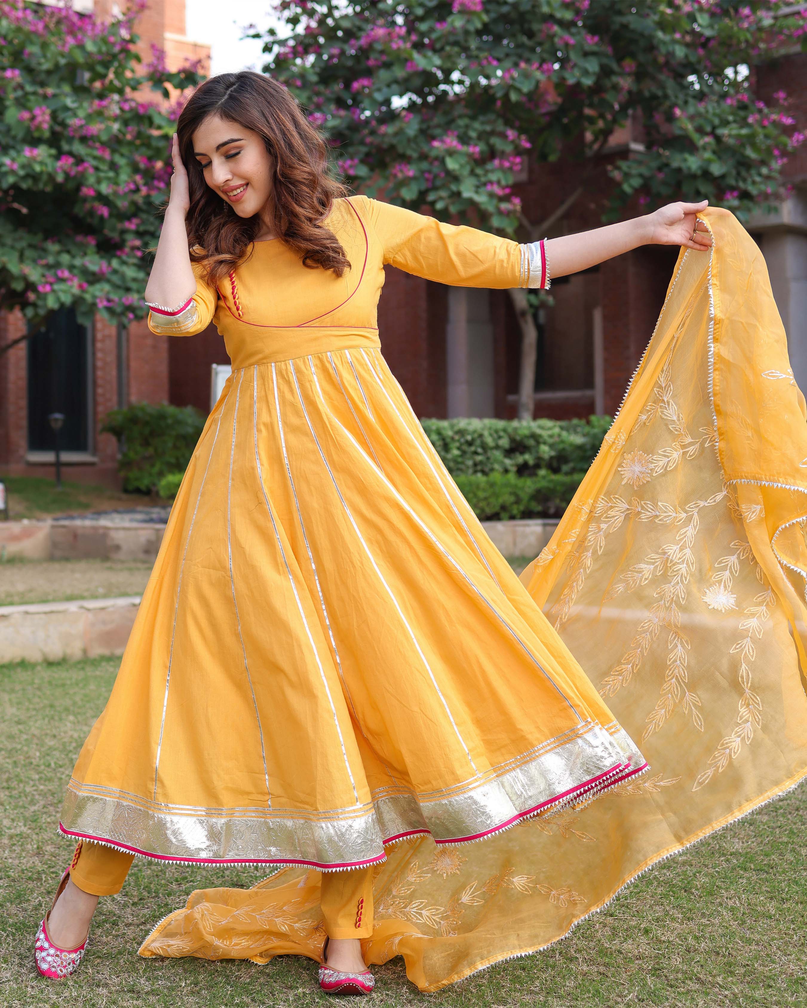 Elevate your festive wardrobe with this Yellow Gota Patti Suit Set, designed to exude timeless elegance. The soft cotton base ensures comfort, while the pure organza dupatta with handcrafted detailing adds a touch of sophistication. Perfect for festive gatherings and cultural occasions, this suit set blends traditional charm with modern grace.